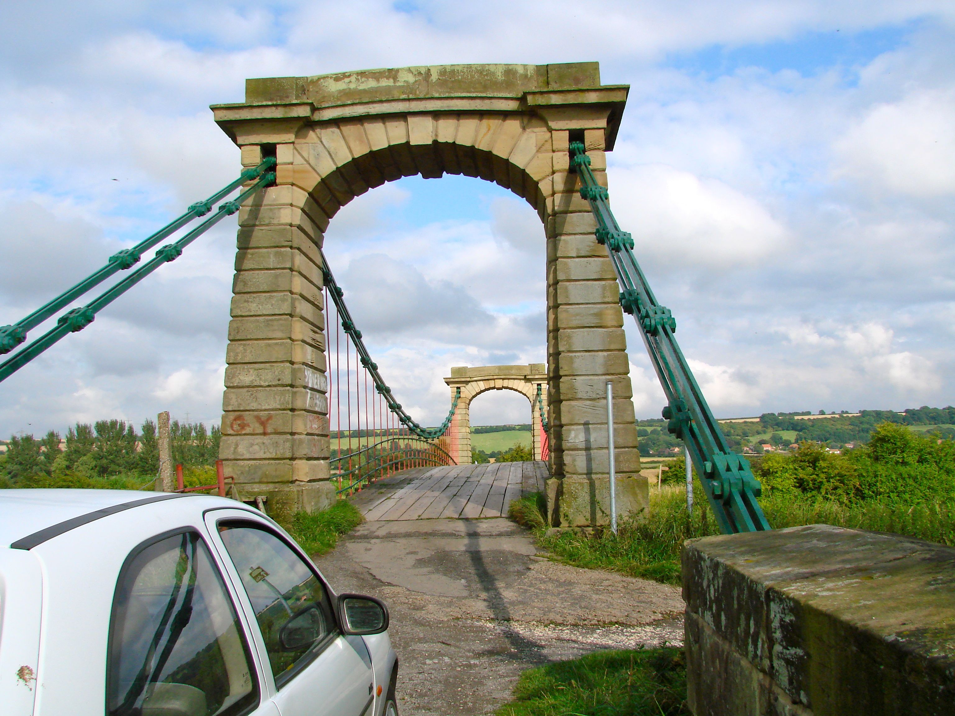 Rennie designed this bridge as part of his 1825-44 River Ancholme Drainage Scheme and it remains just as he designed it. The sophisticated masonry towers have semi-elliptical arches over the 14 foot wide roadway. The single span of 134 feet has double wrought iron suspension chains, each of which is made up of seven foot long rods, on either side of the bridge. Square iron hangers support the 33 timber cross members under the wood deck. There is a lot play in the convex road bed when the bridge is crossed by a vehicle. Fortunately, it is located on a country road that experiences very light traffic.