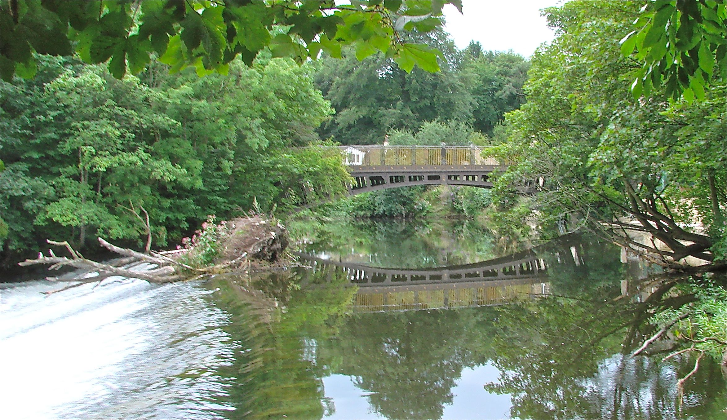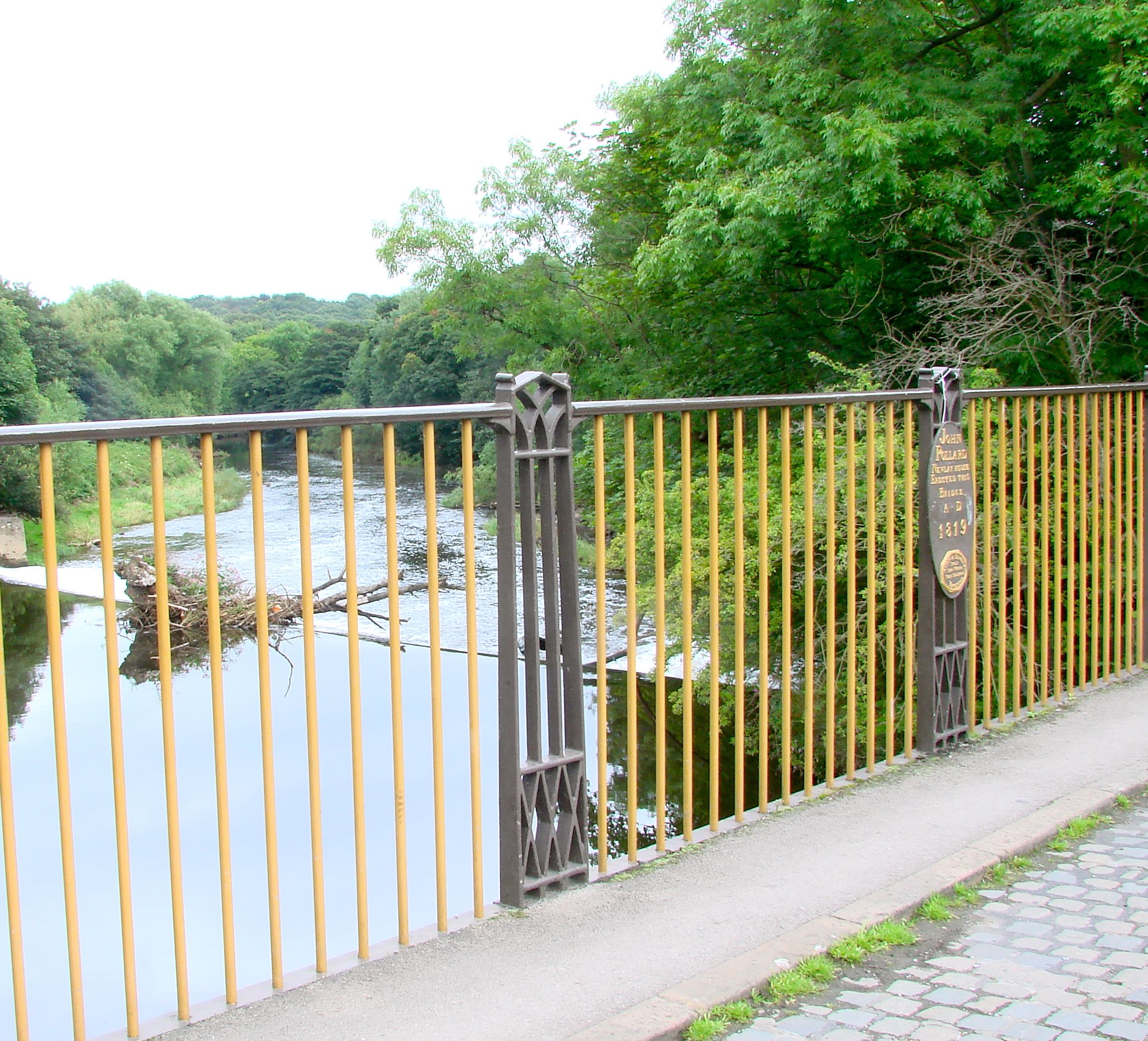 This charming small bridge below the town of Horsforth was built by John Pollard of Newlay House to cross the River Aire. It was cast by Aydon and Elwell of Shelf Ironworks near Bradford. It was originally built as a toll road between Horsforth and Newlay. Its 82 foot span is carried by four cast iron ribs with rhomboidal pierced design in the spandrels. Since it is only ten feet wide, it is now a foot bridge. It was repaired in 1973.