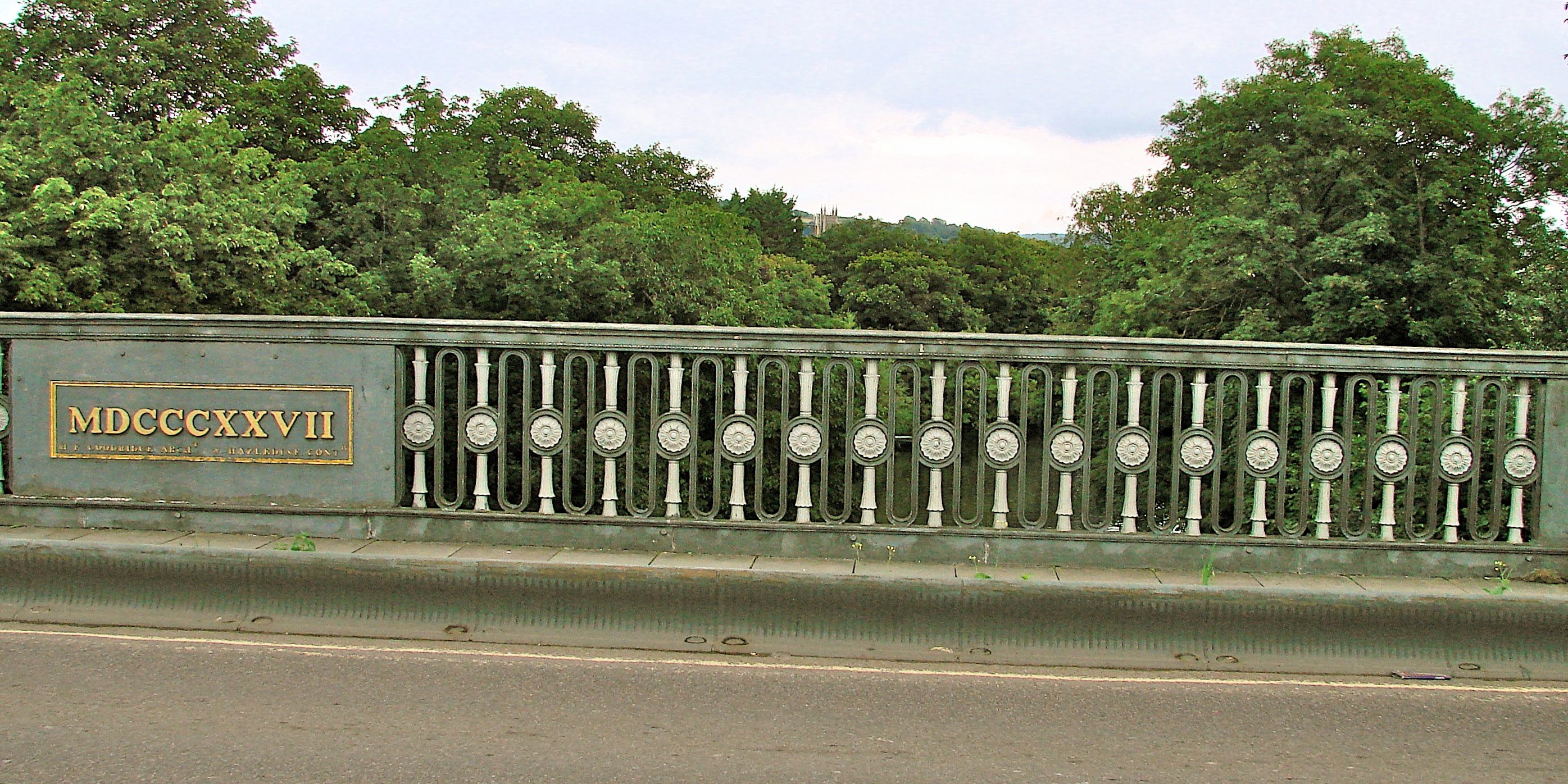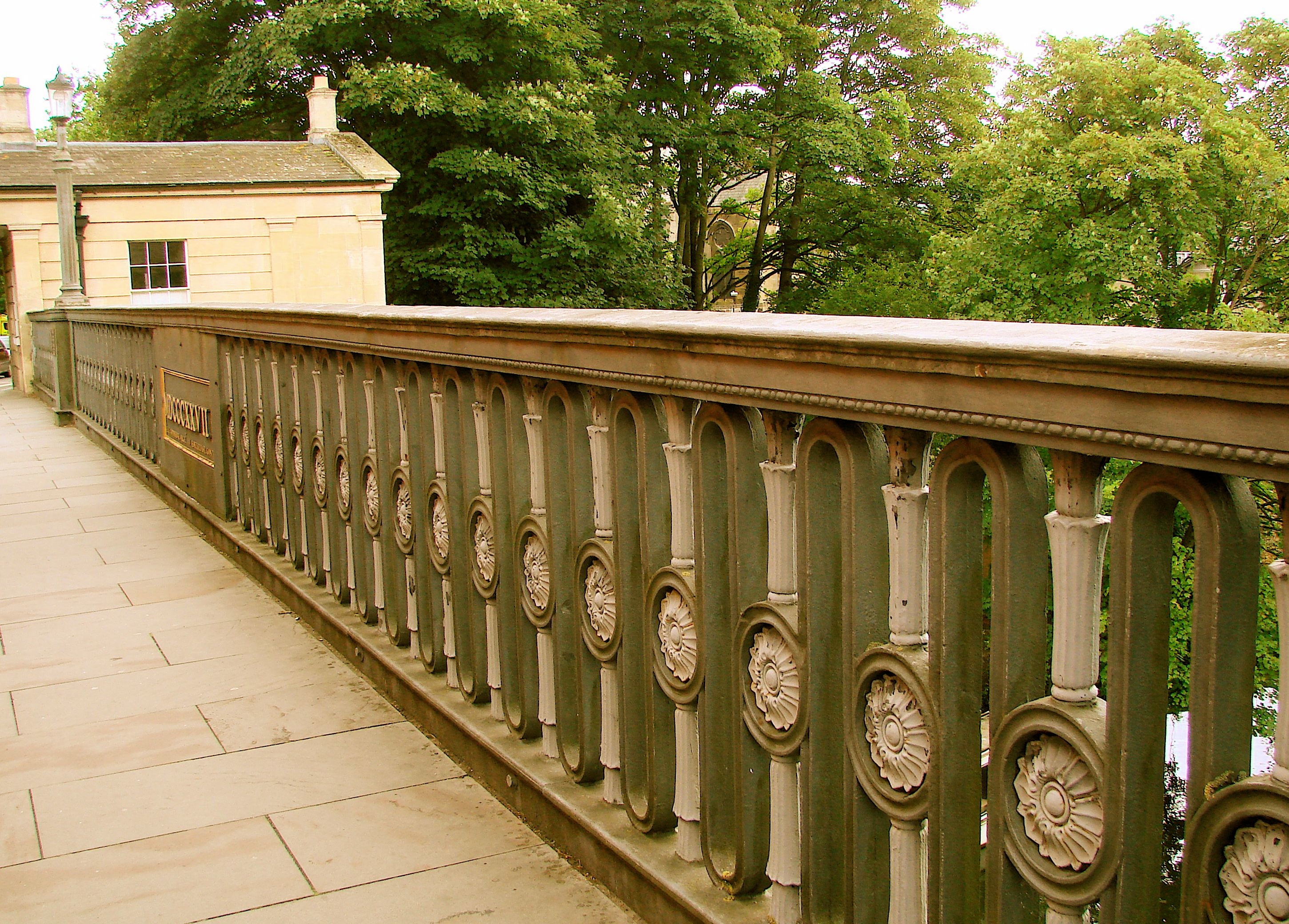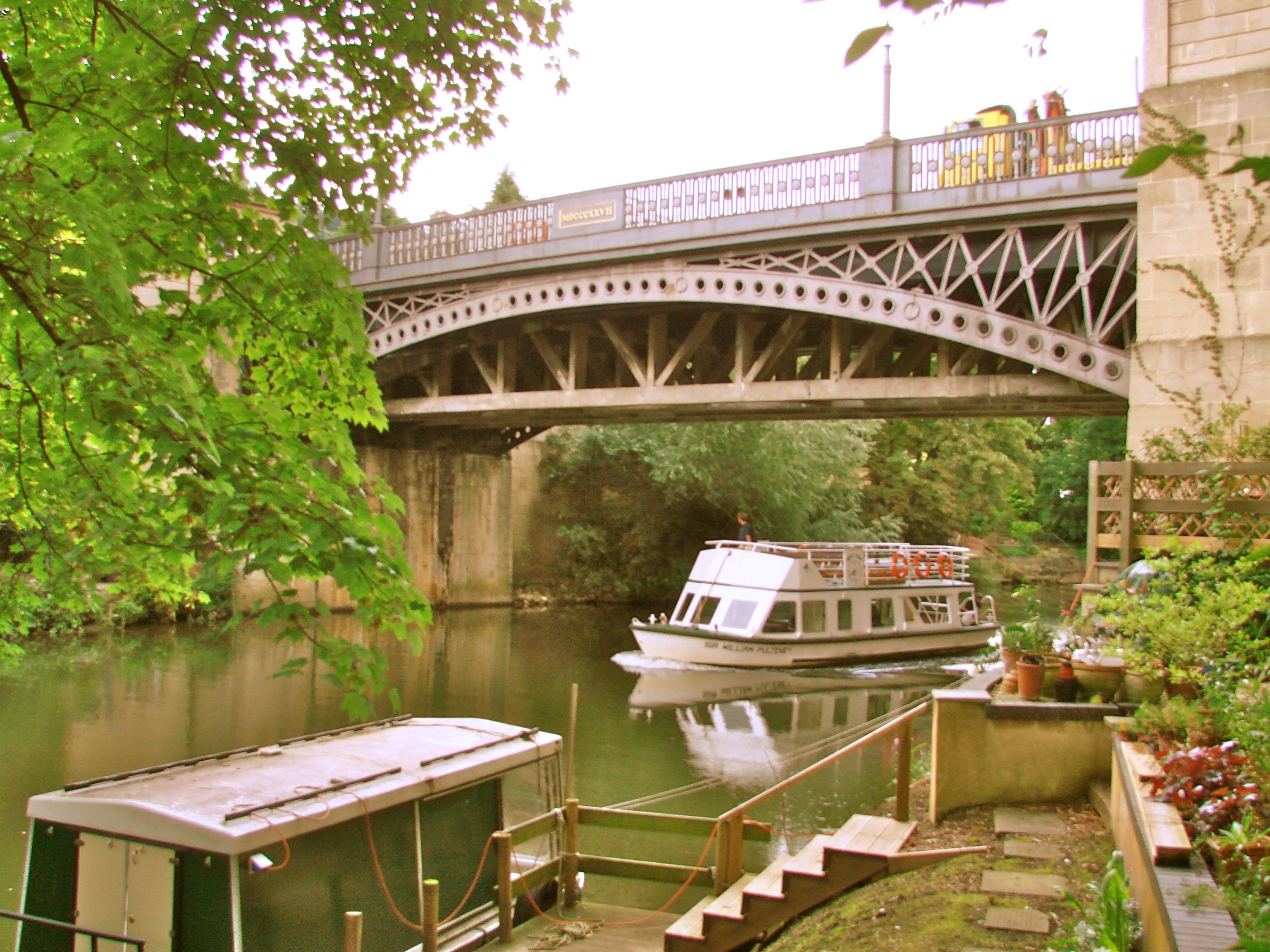 This arched cast iron bridge - designed by Henry Goodridge and built by William Hazledine of the Coalbrookdale Iron Works - crosses the Avon River at Cleveland Place in the heart of Bath. Small Georgian pavilions mark the four corners of the bridge – one of which was the toll house - echoing those around Cleveland Place. An Its incorporation and construction by the Bathwick Bridge Company was authorized by Act of Parliament. Unfortunately, the founding directors set the toll in perpetuity at one pence and by 1925, the City Council had to take over the bridge from the bankrupt company. In 1928-9 the bridge was re-enforced considerably to accommodate the weight of modern traffic.