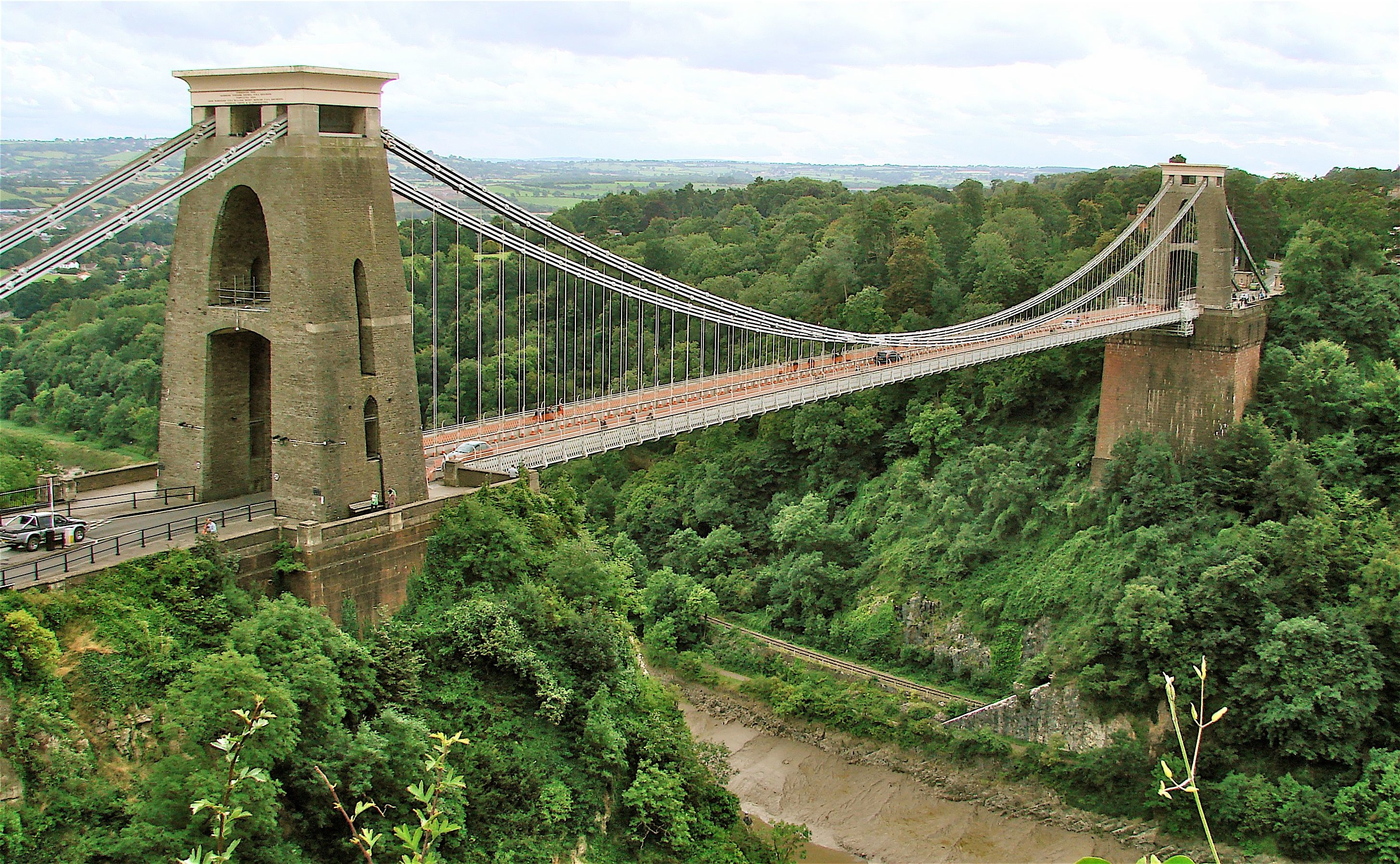 William Vick left 1000 pounds in 1753 to be invested until ten thousand pounds had accumulated which was to be spent on his dream of a bridge across the Clifton Gorge of the Avon River. In 1829, the 25 year old I.K. Brunel won a design competition set by the Trustees. Construction began in 1836, but was suspended when the money ran out six years later. The stone towers were in place, but still in rustic condition. The iron chains were sold to be used for Brunel’s Royal Albert Bridge at Saltash. After Brunel’s death in 1859 the Institution of Civil Engineers finished construction of the bridge as Brunel's memorial. John Hawkshaw and W.H. Barlow amended the original design making the bridge deck a little wider and with triple suspension chains and brought it to completion in 1864. Brunel’s 1845 Hungerford suspension foot bridge in London was being torn down and its iron chains were bought to use at Clifton.