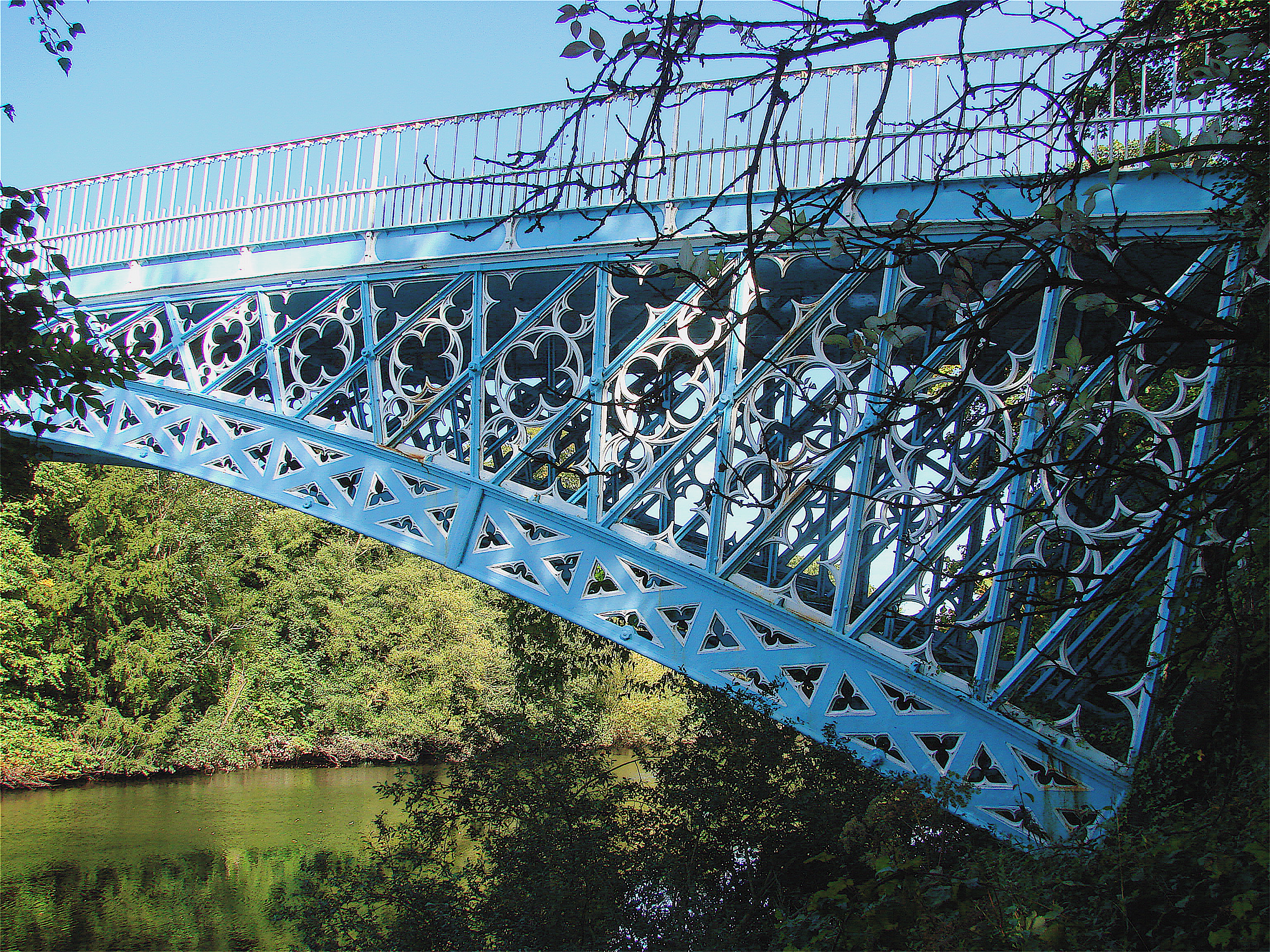 PRIVATE PROPERTY This superbly cast iron single span arched bridge of four ribs which carries the private drive of Eaton Hall over the River Dee a few yards upstream from where the Roman road Watling Street crossed it at a ford. It was designed for the second Earl Grosvenor for his estate beside the village of Eccleston near Chester. It was either designed by Telford or his design for the Craigellachie Bridge was repeated by Hazledine. It is 17 feet wide and spans 150 feet. It has a subtle double horizontal curve and a lovely, crisp gothic design in the spandrels and a graceful, simple railing. It proudly names the team that built it: William Hazeldine, Contractor; William Stuttle, Clerk of Works; William Stuttl, Jr., Founder; William Crosley, Surveyor.