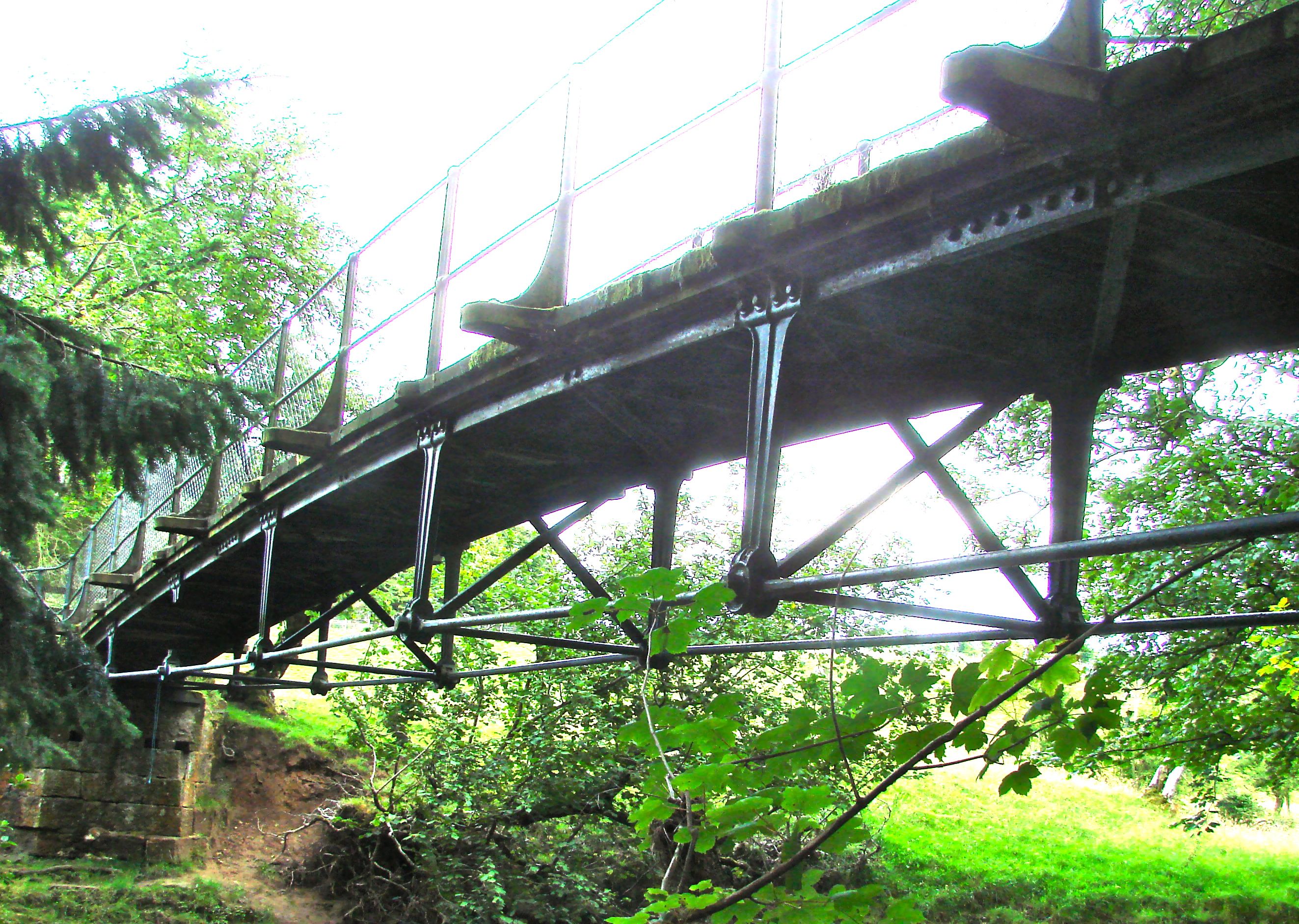 It is an early tied-arch by which is meant that the horizontal bars are in tension to maintain the bow of the arched deck. The shallow arch of the bridge is supported by cast iron feet resting on two level iron pipes. The parapet consists of slender posts and two horizontal rails (now supplemented by wire mesh). The effect is very airy and original. It's date is probably late Regency judging only by the style of the posts: 1820's or 30's.